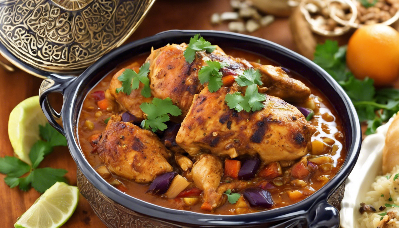 For a traditional Moroccan-inspired meal, serve the chicken and its rich, spiced sauce over a bed of fluffy couscous. The couscous will soak up the flavorful juices, creating a perfect balance of textures and tastes. If you prefer, you can substitute couscous with steamed basmati rice or even quinoa for a slightly nutty flavor and added nutritional value.